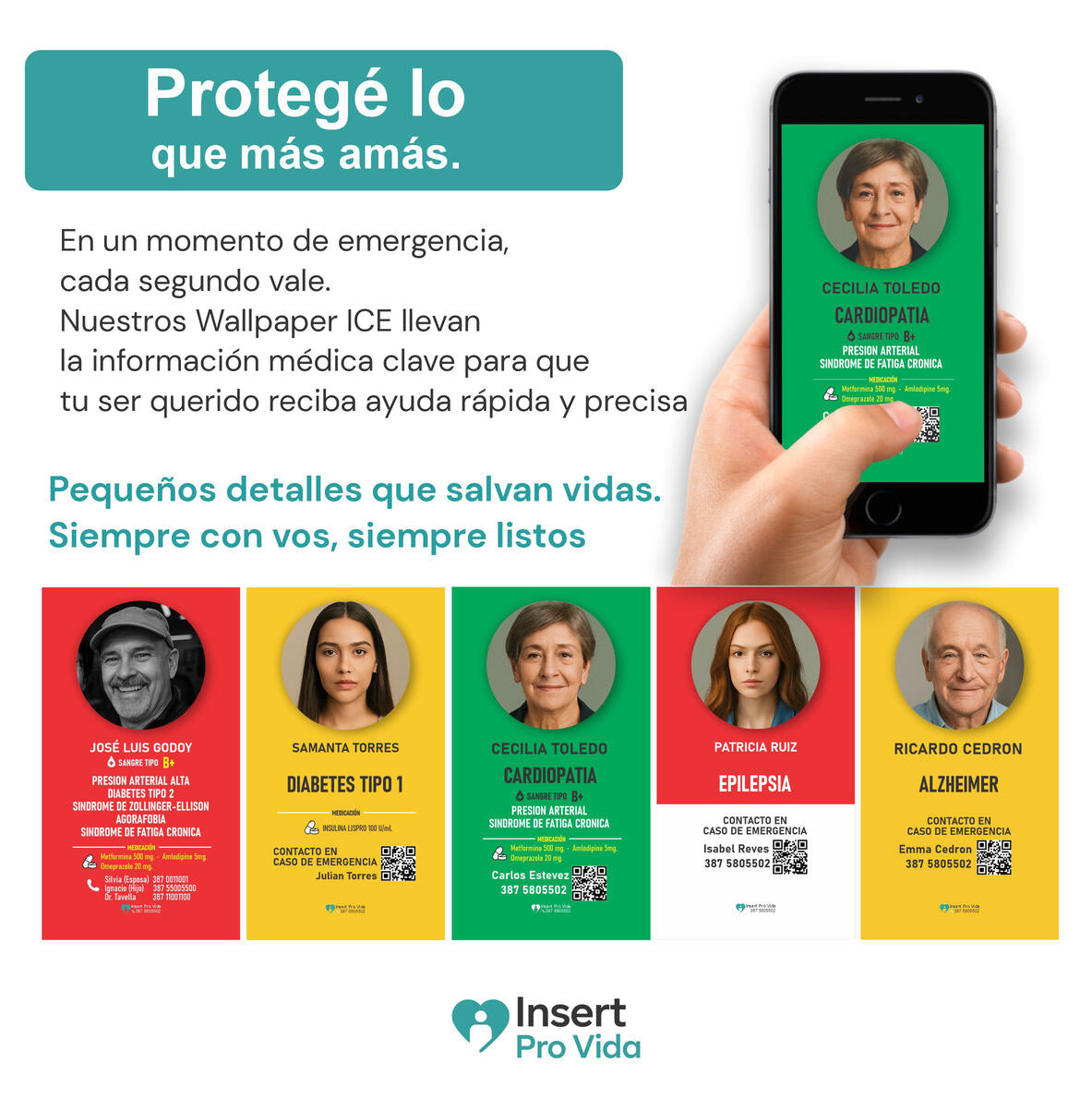 ICE significa In Case of Emergency (En Caso de Emergencia).Es una tarjeta personal, portátil y visible que contiene información médica esencial para ser utilizada cuando más importa: durante una emergencia, cuando el portador no puede comunicarse por sí mismo.La tarjeta ICE permite que cualquier persona —un médico, un vecino, un policía o un bombero— tenga acceso inmediato a los datos más importantes:• Nombre y condición médica